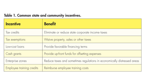 Incentives include tax credits, tax exemptions, tax reductions, low-cost loans, cash grants and employee training reimbursements (see Table 1, p. 38). Many communities offer their own breaks that companies can couple with state programs to offset costs when relocating or adding new facilities. Incentives are usually tied to employment: The more jobs a company plans to create, the more attractive the deals.