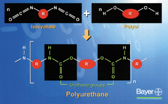 The basic polyaddition reaction of isocyanate and polyol to form urethane groups was discovered at Bayer’s research laboratories. |