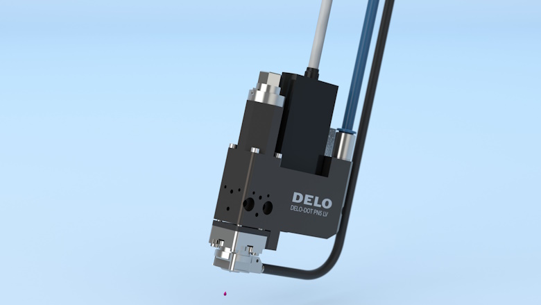 This new device widens DELO's existing portfolio of dispensing valves. While the closely related DELO-DOT PN5, introduced in 2022, was developed for more viscous, highly filled materials, the new LV (low-viscosity) variant is primarily aimed at dispensing smaller droplet sizes of low-to-medium-viscosity media with up to 35,000 mPa·s.