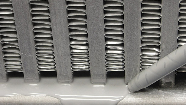 The CAG manufacturer asked Silicone Solutions for help. Silicones were the only materials considered due to the long-term service exposure to temperatures over 300°F. In one week, Silicone Solutions responded with SS-1801, Radiator Coating Liquid RTV, which has the ability to seep into the CAG’s several sub-layers and efficiently bond to, seal, and coat the base of the CAG around the fin mating areas.