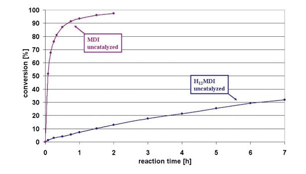 In addition to the isomer differences, certain electronic differences between MDI and H12MDI can affect reactivity, as shown in Figure 2. MDI and H12MDI were respectively reacted with n-octanol in a 55% solution of MOP-Ac at 80°C, and the conversion of the diisocyanates to dioctyldiurethane was monitored over time. Figure 2 shows the dramatically reduced reaction rate of n-octanol with H12MDI compared to MDI at 80°C. Despite the difference in reaction rate, the reaction of H12MDI can be catalyzed with only 0.01% DBTDL to reach the same conversion profile as MDI. Thus, despite the electronic differences between MDI and H12MDI, the reactivity difference can be compensated with a minor amount of catalyst.