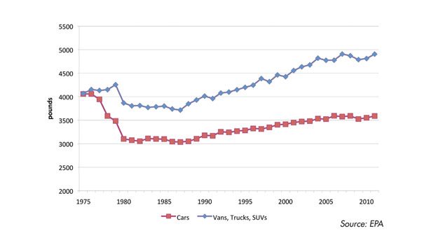 Since the early 1980s, cars and light trucks have steadily increased in weight (see Figure 1). This is due to a number of factors, including consumer preference for larger vehicles—as seen in the emergence of new classes of vehicles like SUVs and minivans—as well as an increase in both safety and amenity items, including air bags, anti-lock brakes, power windows and locks, and additional noise insulation (NVH).