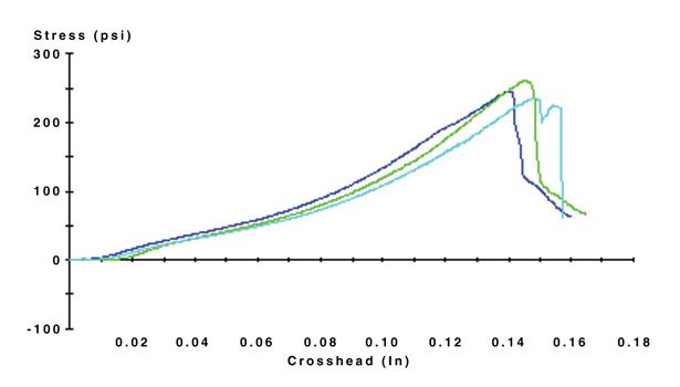 A lap shear test is typically conducted to quantify the adhesion strengths of silicone film adhesives. Per lot in three replicates, the films are bonded at 0.012 in., cured at 65°C, and pulled apart at 0.02 cm/min using an MTS loading frame. Figure 1 depicts the results for a two-part, unfilled silicone film adhesive tested for lap shear via these parameters.