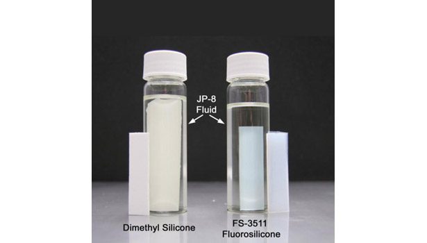 Materials that resist swell when in contact with fuels, hydrocarbon solvents, and glycols are often required to maintain the effectiveness of integral parts in air or spacecraft, and, by extension, to preserve the functionality of the vehicle as a whole. Compared to conventional dimethyl silicones, fluorosilicones provide higher swell resistance and therefore even longer reliability in prolonged exposure. Fluorosilicones are commonly used in aircraft and aerospace applications for their lack of swell in glycol de-icing fluids and fuels common to the aircraft industry, such as JP-8 and Jet A.
