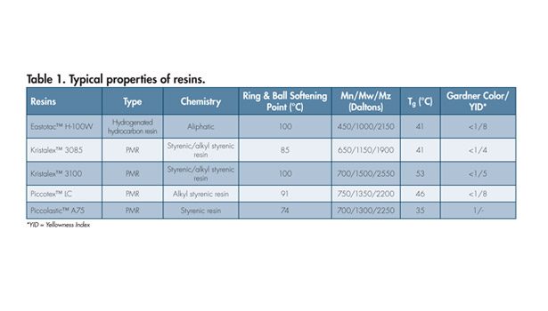 Packaging adhesives using EVA can be formulated using a variety of tackifier systems, including rosin esters, hydrocarbon resins (C5, C9, C5/C9), terpene resins and hydrogenated hydrocarbon resins.2-7 However, for premium packaging adhesive applications where clarity, thermal stability and temperature resistance are critical, EVA-based packaging adhesives are often formulated with hydrogenated hydrocarbon tackifiers.