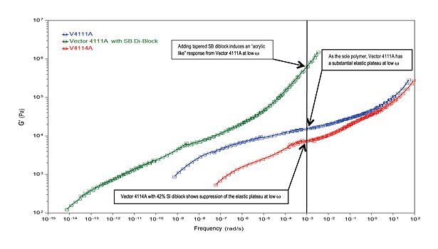 The lower modulus exhibited by the SBS/SB Vector 4114A blend is significant because a low G’ is as important to die cuttability as the suppression of the elastic plateau. For good die cutting, the modulus should be below 104 Pa. Although adding the tapered SB diblock to Vector 4114A suppresses the elastic plateau, the modulus is significantly above 104 Pa. Hence, more formulating will be required to bring the modulus of the adhesive below 104 Pa (see Figure 4). Although Vector 4114A does not fully suppress the elastic plateau at 10-3, it does have a modulus below 104, thus making the adhesive die cuttable (see Figure 4).