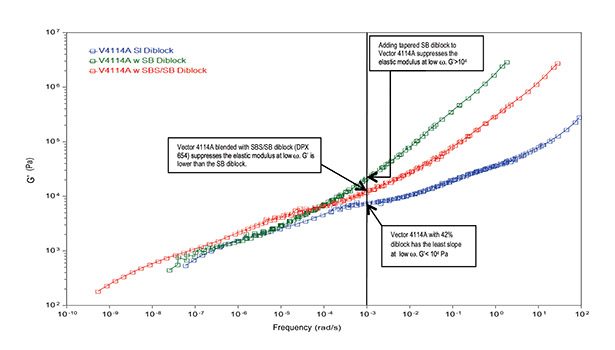 Figure 3 further illustrates the suppression of the elastic plateau through the addition of diblock. The figure shows TTS curves for three adhesive blends with different types of diblock. In the first blend, Vector 4114A, which contains 42% SI diblock, shows some slope at 10-3 radians/s. The second blend, using the tapered SB diblock, shows very steep slope and complete suppression of the elastic at 10-3 radians/s, as it did with Vector 4111A. The third curve, a blend of DPX 654 SBS and Vector 4114A, shows a complete suppression of the elastic modulus at 10-3 radians/s, but at lower modulus than the blend with the tapered SB diblock.