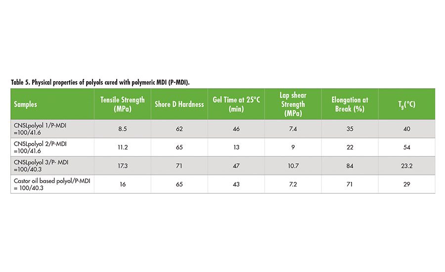 Table 5 contains physical properties of polyols when they are cured with polymeric MDI(P-MDI). CNSLpolyol 2 is light in color and a fast cure polyol compared to CNSLpolyol 1, while CNSLpolyol 3 offers higher tensile strength and elongation with a comparable performance to castor oil-based polyol.