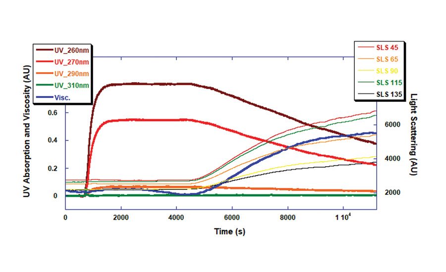 Figure 3 shows raw signals vs. time. The four UV signals decrease in a first order exponential manner as the double bonds in the monomer break to form polymer. The viscosity and 5-angle light scattering signals increase with the polymerization as the molecular chains of the polymer increase in mass. Figure 4 displays raw signals from the 2EHA and AA copolymerization reaction vs. time.