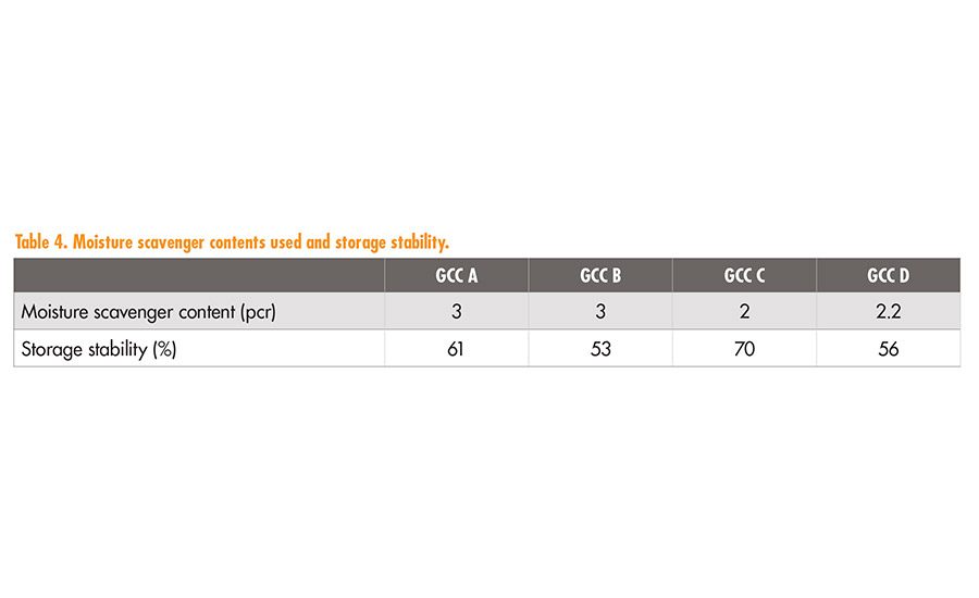 Laboratory tests have shown that a 30% reduction of moisture scavenger in the formulation is possible due to these low-moisture and low-moisture pick-up grades. Testing has also indicated that the use of GCC C and GCC D has a positive impact on silane-terminated polyether sealant stability. An example of this is shown in Table 4.