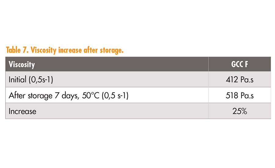 Despite having higher moisture, GCC F led to adhesives with good storage stability. The initial viscosity results and the values after storage for 7 days at 50°C are presented in Table 7). The increase in viscosity after storage was moderate and acceptable at around 25%. These findings demonstrate that the incorporation of GCC F would be useful in increasing rheological and mechanical properties while maintaining good storage stability.