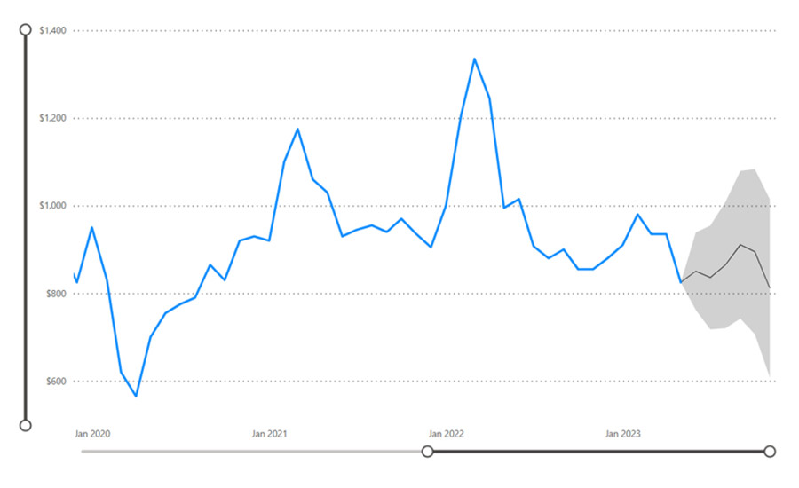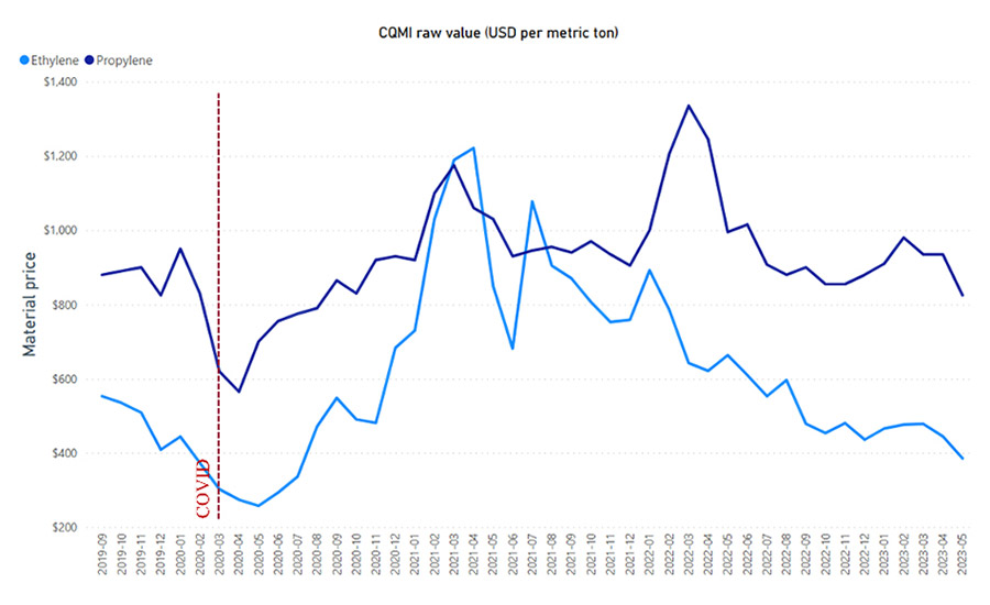 As we peer into the future, the trajectory of the global ethylene price is projected to maintain a steadfast stability, albeit at a lower level, as indicated in Figure 4. The TraQr™ advanced forecasting tool takes into account the notable surge in ethylene prices witnessed in the aftermath of the COVID-19 pandemic.