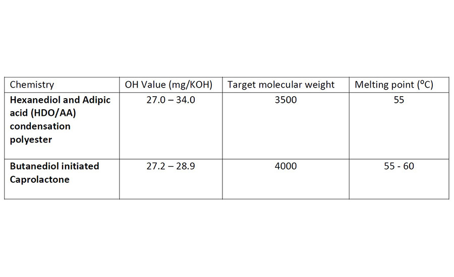 A study conducted at Ingevity’s new Innovation Centre in Warrington, UK, has fully characterized the performance of a 4,000 MWt caprolactone diol versus that of a commercially available polyester diol. Table 1 shows the details of the polyols used in the study.