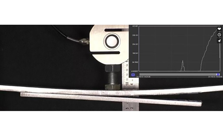 This comparative technique is used to assess the relative flexibility of adhesives when applied to a metallic substrate. In this test, a mild steel panel of dissimilar dimensions – Plate 1 550 x 50 x 10 mm thick and Plate 2 225 x 50 x 10 mm thick – are stressed to the point the adhesive fails. The panel is held in position at two points, one at either end of the sample, and is gradually stressed at a single point in the center of the specimen via a hydraulic press as seen in figure 5. The greater the displacement i.e., the further the press travels until failure, the more flexible the adhesive. The thickness of the adhesive will influence the degree of flexibility, so analysis should be duplicated for repeatability purposes. In the case of this testing at the manufacturing stage, the specimens were compressed by hand pressure only to try and replicate “in field” applications of achieving below the maximum bondline thickness of 2mm.