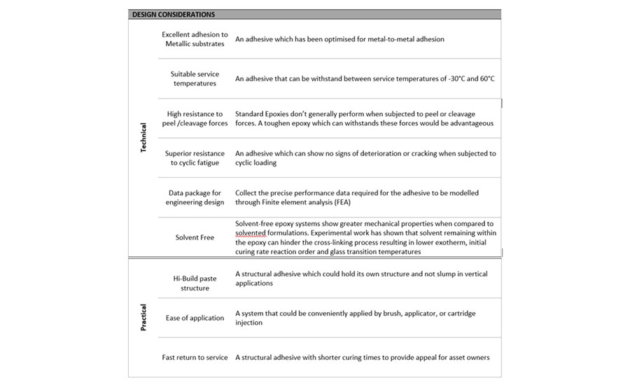 Design considerations for Belzona 7311, the adhesive being studied, were based on both technical target requirements and a practicality approach, as summarized in Table 2.