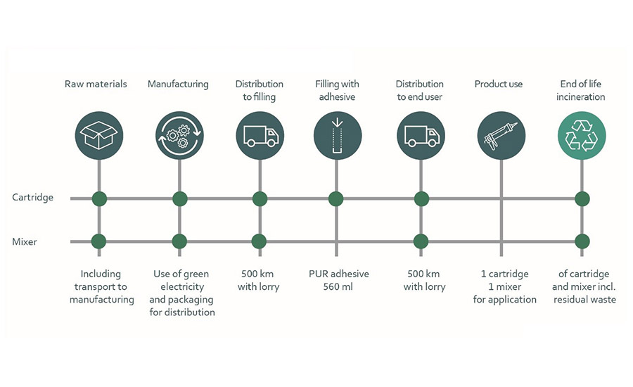 First, the product system to be analyzed must be defined (Figure 10). In this example, the environmental impact of the packaging and the contents of a two-component adhesive are added. In order to clearly delimit the analysis of the system, the products in which the adhesive is used are not part of this analysis. The LCA is designed to compare two different packaging systems in terms of their environmental impact, so the bonding process — including preparation, cleaning, and use of primers — the use and effect of dispensing equipment and the labeling and packaging of the filled products are not considered.