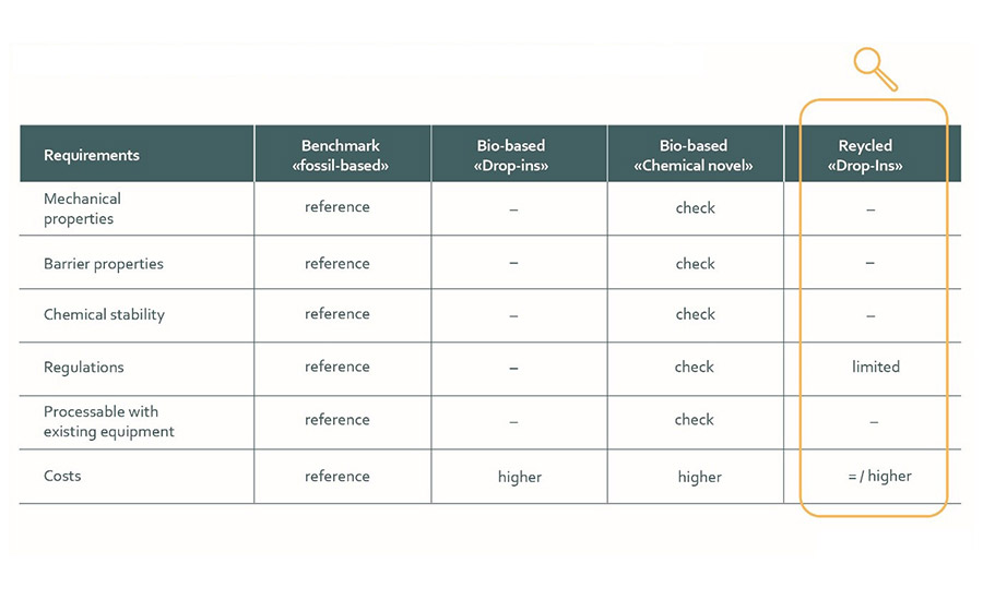 These aspects must be considered when selecting materials. If a reference product is made from a fossil-based plastic, a more sustainable material must be selected that fulfills the mechanical properties and chemical resistance of the original. To be successful in switching from carbon-intensive raw materials to more sustainable options, it is important to be able to use existing production processes and facilities. For injection molding, this means using the same machines and molds. Today, sustainable alternatives to virgin plastic are generally more expensive, as the production process is more complex and manufacturing volume lower. In the future, this difference could decrease due to economies of scale with bioplastics or legislation that makes the use of fossil fuel-based plastics more expensive, like additional taxes. Recycled "drop-ins" have the largest overlap and therefore offer great potential for more sustainable products (Figure 4). The aim here should be to use the recycled material for a sophisticated technical application in which petroleum-based plastics would normally be utilized.