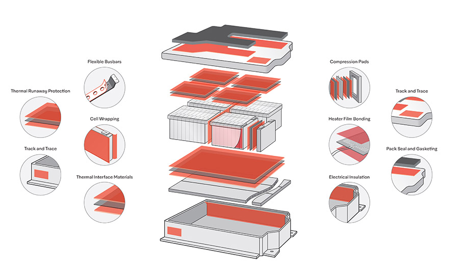 Within the battery pack, the bonding of dissimilar materials and encapsulation of different components is an area where PSA tapes and films can add efficiency and ease of manufacturing. Below are a few examples of materials used for bonding and encapsulation within battery packs.