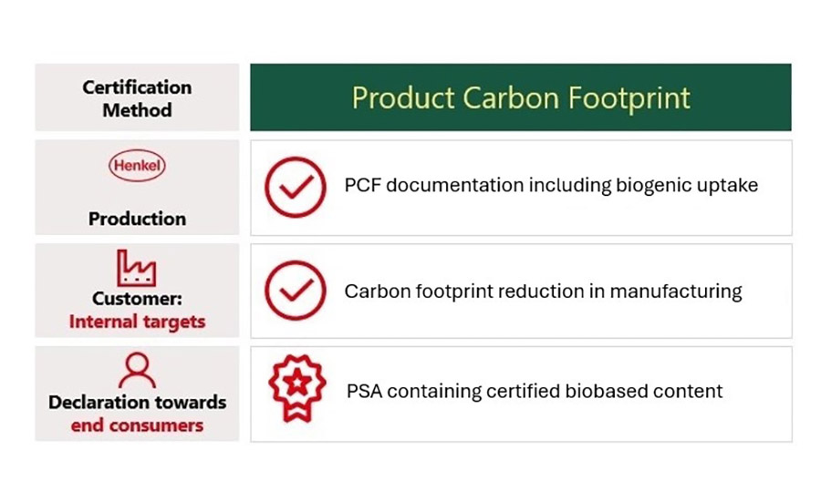 Henkel conducts standardized Life Cycle Assessments (LCA) that cover all environmental impacts during production, use phase, and disposal as well as the associated upstream and downstream processes (e.g. production of raw materials). Impacts include all environmentally relevant withdrawals from the environment (e.g. bio-mass, crude oil) and emissions into the environment (e.g. waste, carbon dioxide emissions). A comparative cradle-to-gate LCA between TECHNOMELT PS 5052 ECO adhesive and a traditional fossil-based hot-melt PSA shows a reduction in product carbon footprint. A roughly 16% emission reduction (including biogenic uptake and excluding use-phase and end-of-life emissions) was calculated when consuming the Henkel adhesive versus the traditional hotmelt made with fossil-based materials.