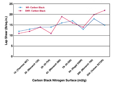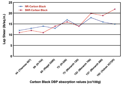 From Figures 1 and 2, it can be seen that the lap shear increases with increasing both carbon-black nitrogen surface area and DBP absorption values. It appears that the increases are more pronounced and correlated with increasing DBP absorption values than they are with increasing nitrogen surface areas.