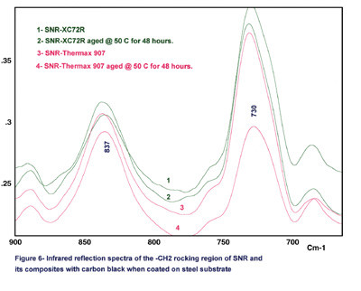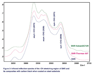 Figure 3 shows the comparison of the reflection spectra for SNR and its composites with carbon black coated on steel substrates. In this figure, Vulcan XC72R (XC72R) and Thermax 907 are shown as examples because of the large differences that exist between their particle sizes and surface areas. Also, the lap-shear results indicate that the XC72R is a strongly reinforcing carbon black and Thermax 907 is a weakly reinforcing carbon black.
