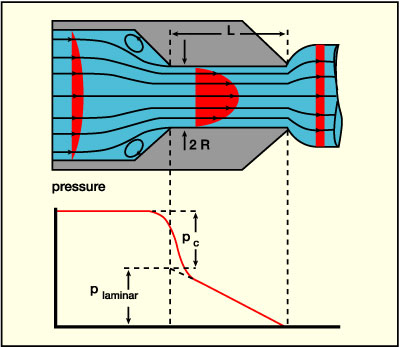· deformation of the flow field from a plug flow within the reservoir to a parabolic flow profile within the capillary