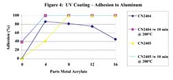 Ceska2, 3 reported adhesion results for a UV-curable coating comparing the CN2404 and the CN2405. In this study, a base monomer, oligomer, and photoinitiator blend was prepared in which the zinc-containing oligomer was varied from 1 to 16 parts. The base formulation is shown in Table 3.