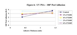Both the CN2404 and the CN2405 were evaluated in UV-curable PSA formulations. A base formulation was made and then 2 and 6 parts of the metal acrylates were added to evaluate adhesion and tack of the PSA. The UV-curable PSA formulation is shown in Table 4.