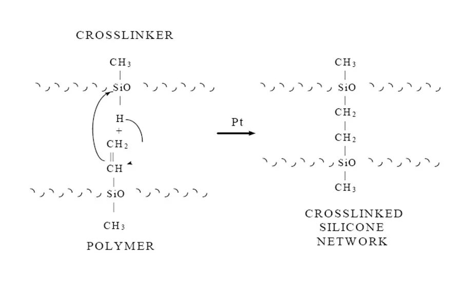 The cure mechanism for this addition-cure system involves the direct addition of a hydride functional crosslinker to the vinyl functional polymer, thus forming an ethylene bridge crosslink (see Figure 1). Because this mechanism involves no leaving group, unlike the one-parts, these systems can cure in closed environments.