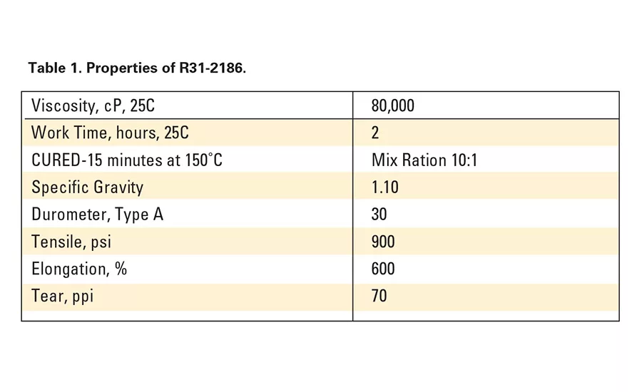 To promote adhesion to novel substrates, SP-270, a unique primer containing a proprietary blend of silanes, catalysts and solvents, was developed. R31-2186, a fast-cure addition-cure adhesive,4 was used in conjunction with this primer. Typical properties are shown in Table 1.