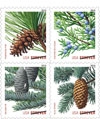 The new stamps feature foliage and cones of four different conifers: ponderosa pine, eastern red cedar, blue spruce and balsam fir, which will grace billions of cards and packages expected to be delivered this holiday season.