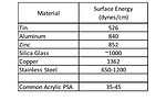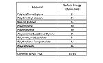 Given the fact that an adherend must have higher surface energy than the corresponding adherent, the common acrylic pressure-sensitive adhesive has no difficulty wetting the materials in Table 1 to form a bond surface. These types of materials have been-and are continuing to be-replaced in new material construction in various applications, including automotive assembly, building and construction, electronics, and medical devices. Many of these market areas are moving toward lighter weight and often lower cost plastic materials, but still require pressure-sensitive adhesives to bond various components. These lighter weight plastic components can be challenging to adhere to because they are generally much lower in surface energy, as seen in Table 2.1