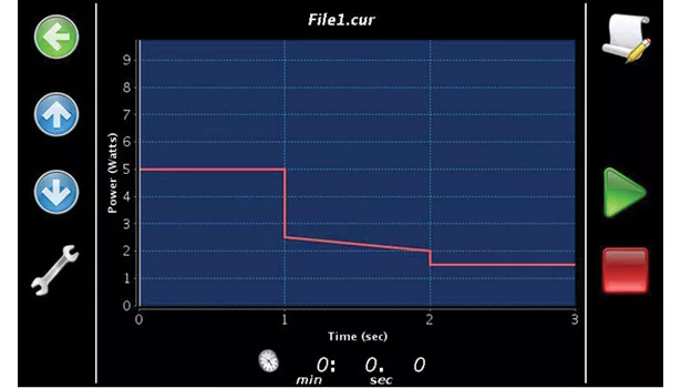 Heating control is also an important consideration for a bonded assembly because the adhesive layer and its adjacent surfaces (e.g., a die to a board) can be locally heated at a controlled rate to the thermal initiation temperature of the adhesive. This also controls excessive flow-out of the adhesive by driving it to the gel point more rapidly and reliably. By controlling the length of time at a set temperature, a temperature profile can be generated that cures the adhesive in a low-stress environment. In Figure 3, a display shows the ability to control the time of exposure, the photonic power emitted, and the ability to generate cure profiles. Spectral control is also possible.