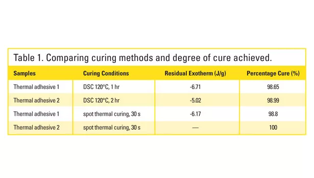 The photonic radiant manner of curing needs to be compared to traditional curing methods since it is not as widely adopted in the microelectronics industry as it is by medical device manufacturers for the integration of micro-optics and micro-electronics into their health care devices. Comparisons are industry- and application-specific, but some basic elements can indicate performance. For example, the degree of cure of a thermally curing adhesive can be determined through differential scanning calorimeters (DSC), among other techniques. Other metrics, such as electrical conductivity measurements, are used when the epoxy formulation is heavily loaded with conductive fillers and when the need for low electrical resistance is the main driver in the use of this type of epoxy.