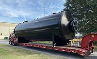 The elliptical-style top and bottom heads include various size flanges and couplings at customer-specified locations. Internal surfaces were reportedly cleaned, dried and media blasted; exterior surfaces were also media blasted and coated with red oxide primer. Prior to shipment, the nozzles were capped and the tank purged with 2 psig of nitrogen, so as to arrive at the customer’s jobsite in a clean, rust-free condition. Lifting lugs and acaged removable ladder and handrail with toe plate were also provided.