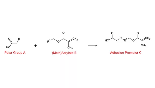 The basic strategy can be seen in Figure 1. In essence, a polar group A is grafted onto either a methacrylate or acrylate molecule to result in an adhesion promoter C. The R and R1 groups were varied in this experimental work.