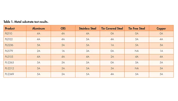 When approaching the selection of the type of UV-curable group that would work the best for adhesion promotion, many formulators will show a preference for either a methacrylate or acrylate depending on their previous experience. This study presented the opportunity to compare the effect of either an acrylate or methacrylate on adhesion when the rest of the molecule remains the same. In this study, PL-2122 and PL-2212 share the same polar group A (see Figure 1) but differ in that PL-2122 is a methacrylate and PL-2212 is an acrylate. In the same vein, PL-2155 is the methacrylate equivalent of PL-2263. There appears to be no consistent advantage in using an acrylate or a methacrylate group when it comes to optimizing the adhesion characteristics of the adhesion promoter.