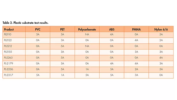 There are two common plastic substrates that are missing in Table 2. The series of adhesion promoters was tested on both untreated polyethylene and polypropylene. In all cases, good adhesion results were not obtained on these two substrates. When formulating coatings for either PE or PP, the typical approach to pre-treat the substrate with a technique such as corona, flame or plasma is usually required.