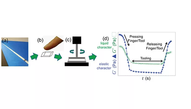 Conventional tests for wet sealants include tooling-tapping and tooling-sliding. For tooling-tapping, as shown in Figure 1a, a sample of sealant is applied to a flat surface, and a finger is tapped on the sample to simulate engaging and disengaging the tool or the finger used to press a sealant into a joint. A value of 1 to 3 is assigned, with 1 giving no peak, and 3 giving a large peak upon removal of the finger. For tooling-sliding, as shown in Figure 1b, a bead of sealant is applied to a flat surface. Both the ease with which a finger can slide and the amount of residual sealant tail left following fast removal of the finger at the end of the bead are assessed. A value of 1 to 3 is assigned, with 1 being the least residual sealant tail and 3 being the most residual sealant tail.