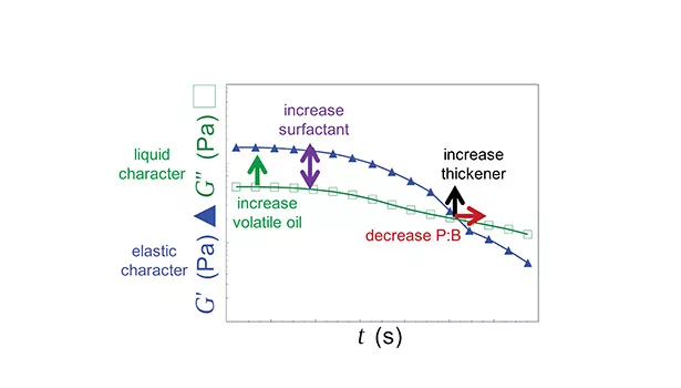 Adjusting the levels of these factors directly influenced the rheology of the sealant. The influences of these factors on the Pressing Finger/Tool portion of Figure 2d are shown in Figure 3. Increasing the volatile oil amount resulted in an increase in the liquid character in the linear region, as indicated in Figure 3, while increasing the surfactant increased the difference between the elastic and liquid character in the linear region. Decreasing P:B moves the modulus crossover point to longer times and higher applied strain, and increasing thickener increases the modulus value where this crossover occurs. Understanding how differences in formulations impact end-product rheology helps to tailor sealants to give the desired consistency and performance.