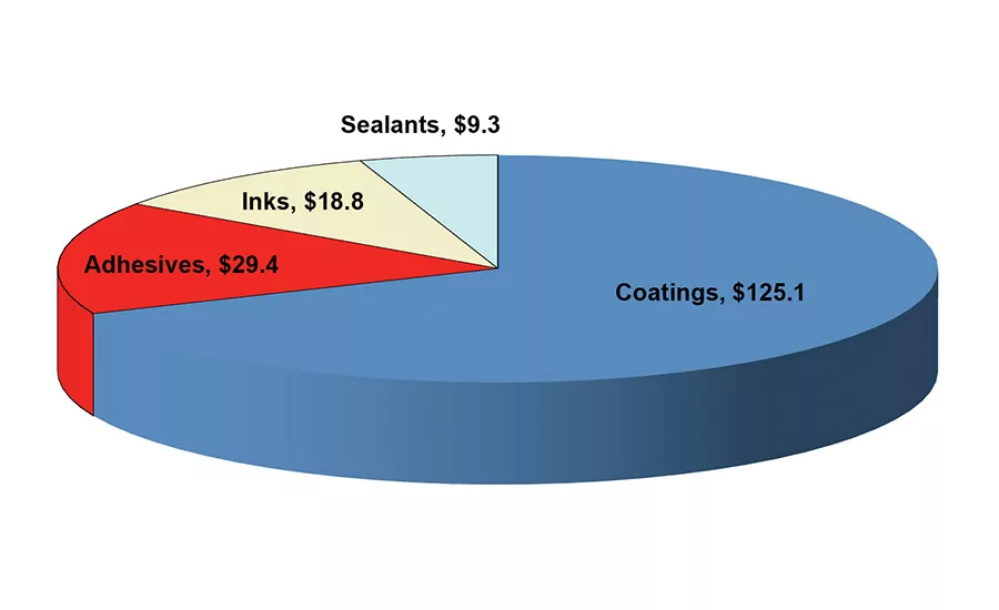 As shown in Figure 1, the coatings industry is the largest segment and accounts for 69% of the value. Adhesives are second with a 16% share, followed by inks at 10% and sealants with 5%.