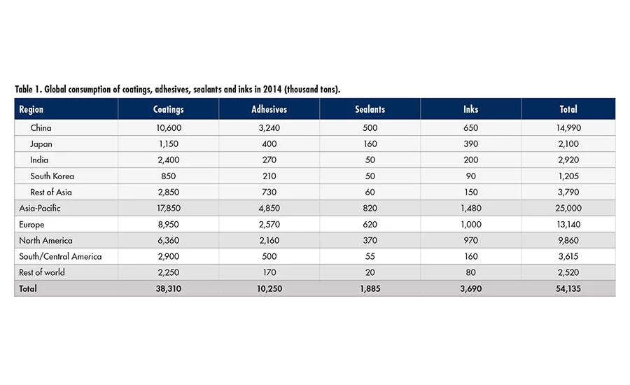 Global consumption of coatings, adhesives, sealants and inks (CASI) was 54.1 million tons in 2014, worth $182.6 billion, according to Kusumgar, Nerlfi & Growney. Volume growth is forecast at a 5% annual rate, with coatings, adhesives and sealants matching the overall growth, but inks trailing at only 2% per year.