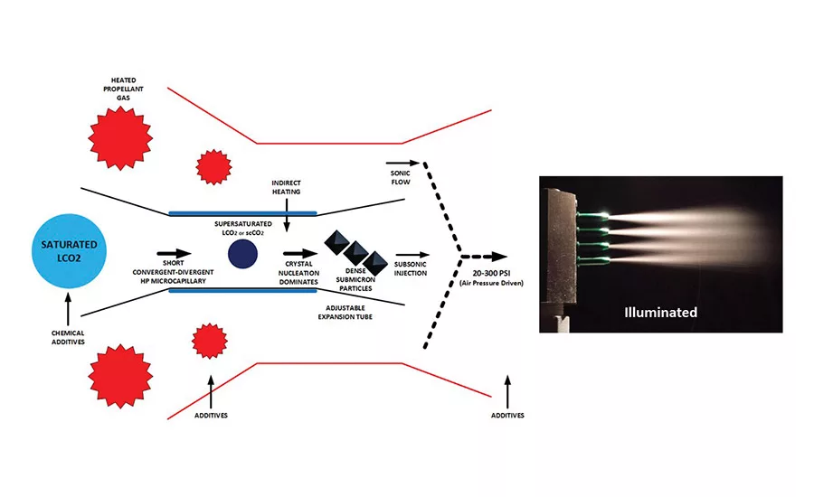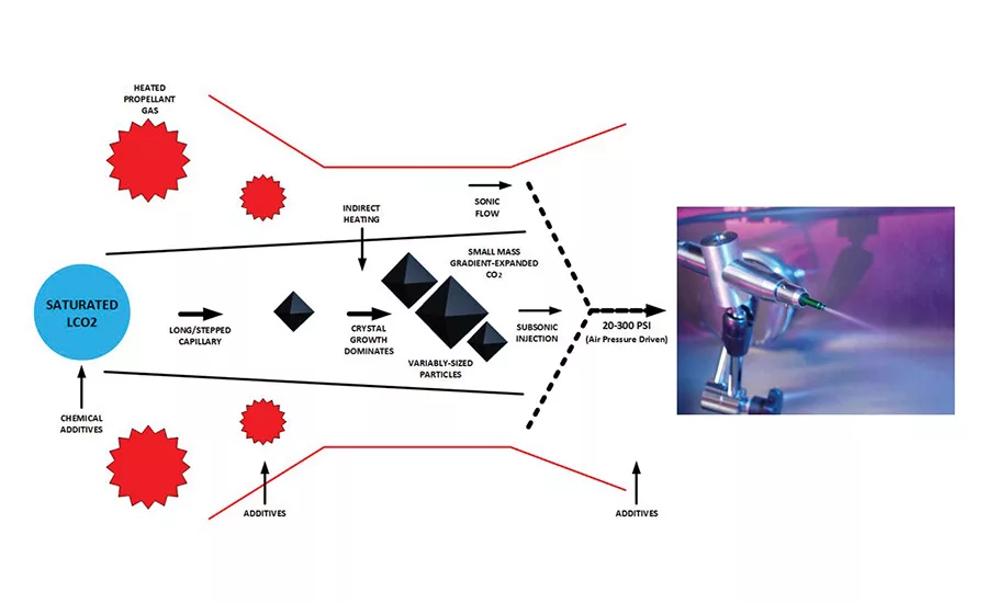 In the latest CO2 composite spray process,* CO2 is converted into a supersaturated fluid and crystallized using a patented micronizing process to form energetic and microscopic CO2 particles having 2x higher density when compared to the liquid state (see Figure 4).8 Micronized CO2 particles are injected into a temperature- and pressure-regulated propellant gas such as clean-dry-air (CDA), and the resulting spray composition is directed at a surface using customizable spray applicators and mixing nozzle configurations.