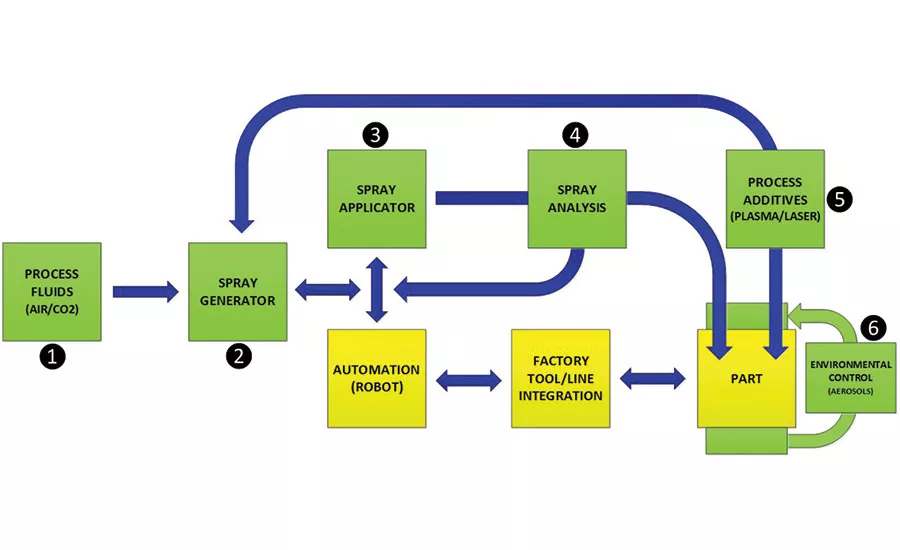CO2 composite spray technology was developed and introduced commercially in the mid-1990s.2 Since that time, it has advanced with more efficient spray generation processes and complementary technology for CO2 fluids purification and delivery, environmental control, and process additives such as plasma.3-7 CO2 composite spray technology is neither a snow gun nor spray nozzle, but rather a system of several integrated components and processes for forming and applying a spray cleaning composition. As shown in Figure 1, a CO2 composite spray system comprises six integrated components: process fluids supply, CO2 spray generator, CO2 composite spray applicator, CO2 composite spray analyzer, process additives, and environmental control to manage airborne particles and surface cleaning effluents (contaminant aerosols).