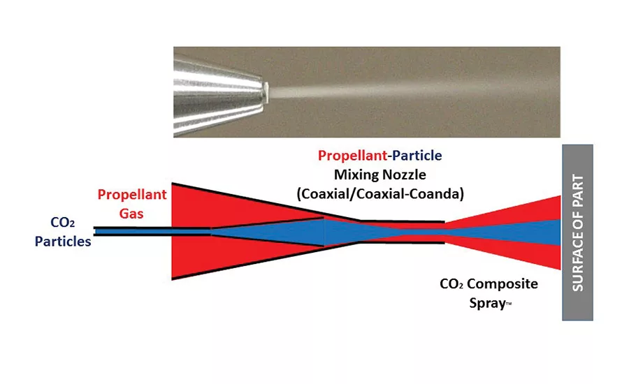 Also unlike CO2 snow guns, CO2 composite sprays are relatively lean and warm with much smaller fractions of microscopic CO2 particles uniformly dispersed in a heated propellant gas. Heated propellant gas compresses, accelerates and shrouds the very cold CO2 particles injected into the center of the mixing nozzle (see Figure 3). The heated propellant gas provides shielding from the atmosphere and heat capacity for the surface being treated. Moreover, heated propellant gas mixes with the cold CO2 particles to produce an increase in thrust. This added thrust is caused by a rapid and fairly large volumetric expansion of the CO2 particles, greater than 800x during the sublimation process (solid to gas phase transition). The result is a highly energetic cleaning spray that does not cause surfaces to become wet during application. Finally, a CO2 composite spray system may also be used with other beneficial cleaning process additives such as atmospheric plasma, laser, and trace organic compounds to provide a robust surface treatment platform.
