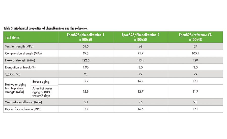 As shown in Table 4, phenalkamide 2 delivers fast bond-strength development combined with excellent mechanical properties such as high tensile, flexural, and compressive strength. Adhesives based on phenalkamide 2 can be used on various substrates, including poorly prepared surfaces as encountered in many construction job sites. Phenalkamides 1 and 3 give longer pot-life and outstanding bond strengths to various substrates. Phenalkamides 1 and 2 are solvent free and low viscosity; therefore, they offer excellent formulation latitude, while solvent-free phenalkamide 3 can provide higher Tg with extended pot life.