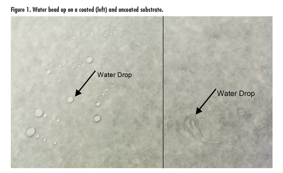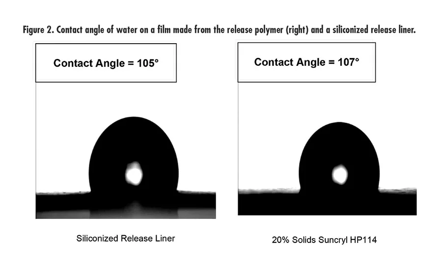 A key characteristic that all high-performance release coatings share is hydrophobicity. Figure 1 shows how water beads up on a substrate coated with a composition based on the release polymer vs. the same substrate without a coating. This indicates strong hydrophobic performance, minimizing the water’s contact with the release liner surface.