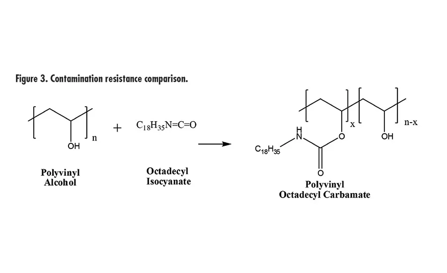 To test contamination resistance, the new release coating polymer was compared against polyvinyl octadecyl carbamate (PVODC), a material used in release coatings available in three forms: solid, dilute solution in toluene or xylene, and water-based dispersion. As a control for testing purposes, the water-based version of PVODC was used (see Figure 3).