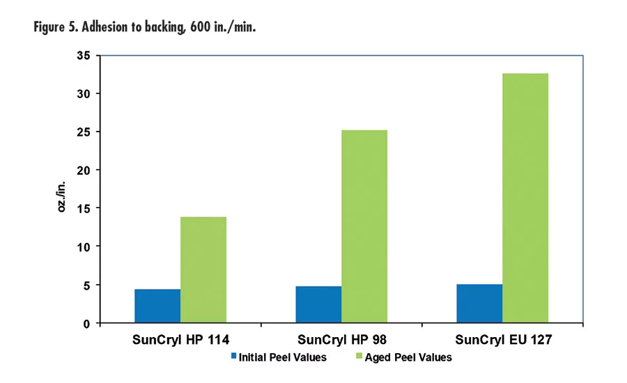 Figure 5 shows results of tests that compare the performance of the release polymer against the other release coatings in the new family of release coating products. All three polymers initially exhibit excellent release. To simulate the extreme storage conditions that tape and label products must often endure, they were subjected to 150°F and 60% relative humidity for 16 hrs.