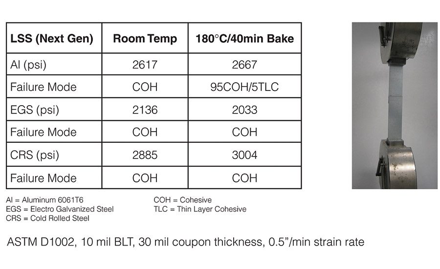 - Bake resistance testing. This test demonstrated that the lap shear strength and the failure mode were not altered during the baking process. Table 3 shows data for testing on various metal substrates in a 180°C/40 min paint bake. Additional testing demonstrated no significant change in lap shear strength during a 200°C bake for up to 90 min on aluminum substrate. This was a significant achievement, since bake resistance had previously been a significant challenge for 10:1 acrylic adhesive systems.